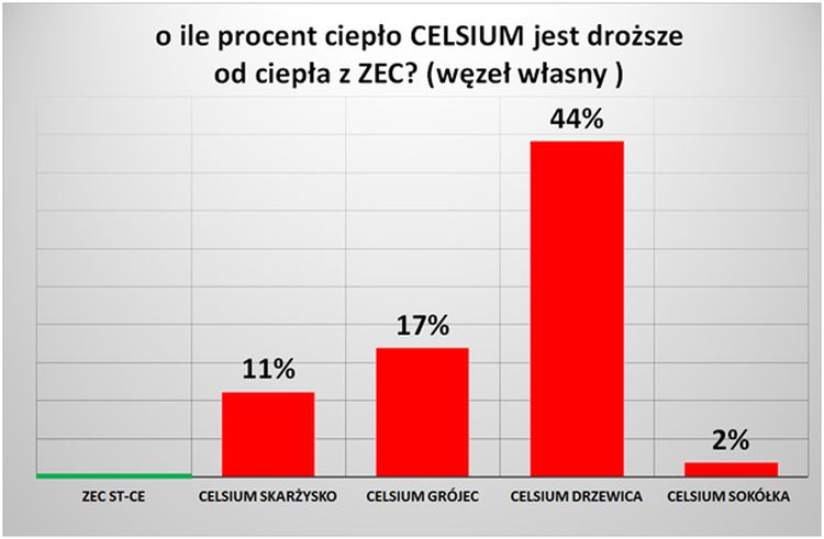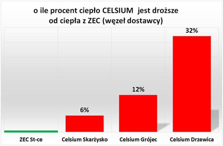 Klienci Celsium w Skarżysku w porównaniu z klientami ZEC muszą zapłacić za ciepło do 13% więcej, taryfa obowiązująca w Grójcu to już różnica do 20%, zaś w Drzewicy to rozbieżność rzędu nawet 79% na niekorzyść odbiorców Celsium. Należy się zastanowić czy mieszkańcy Skarżyska, Grójca i Drzewicy nie muszą znacznie więcej płacić za ciepło, aby Celsium w celu nieuczciwej konkurencji mogło sztucznie zaniżać ceny w Starachowicach?
