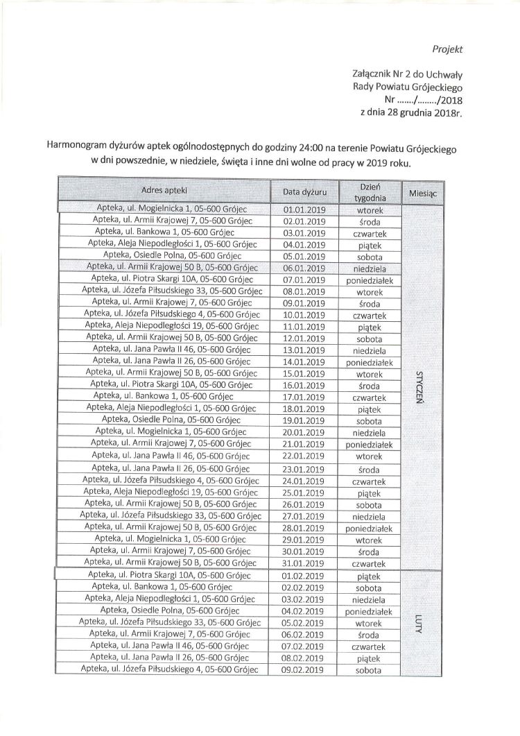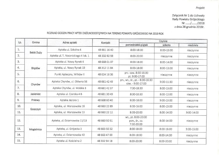 Rada Powiatu Grójeckiego podjęła w czwartek uchwałę w sprawie uchwalenia rozkładu godzin oraz harmonogramu dyżurów aptek ogólnodostępnych w dni powszednie, w niedziele, święta i inne dni wolne od pracy na terenie Powiatu Grójeckiego w 2019 r.