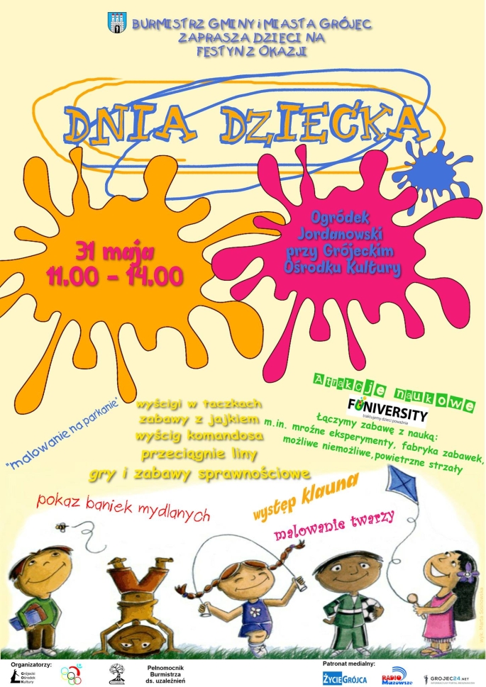 Burmistrz Gminy i Miasta Grójec zaprasza dzieci na Festyn z okazji Dnia Dziecka. Patronem medialnym imprezy jest portal Grojec24.net.