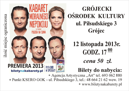 We wtorek 12 listopada o godzinie 17.00 w Grójeckim Ośrodku Kultury wystąpi jeden z najbardziej znanych obecnie polskich kabaretów - Kabaret Moralnego Niepokoju.