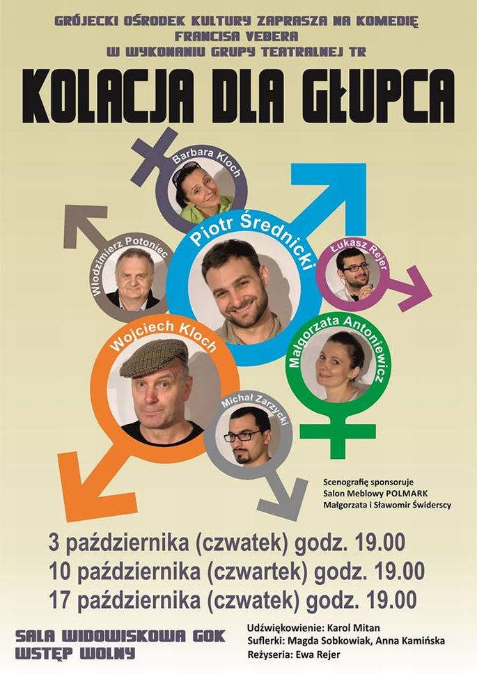 W sobotę 26 października wywodząca się z Grójca Grupa Teatralna TR wystąpi w Bielańskim Ośrodku Kultury, gdzie zaprezentuje spektakl „Kolacja dla głupca”.