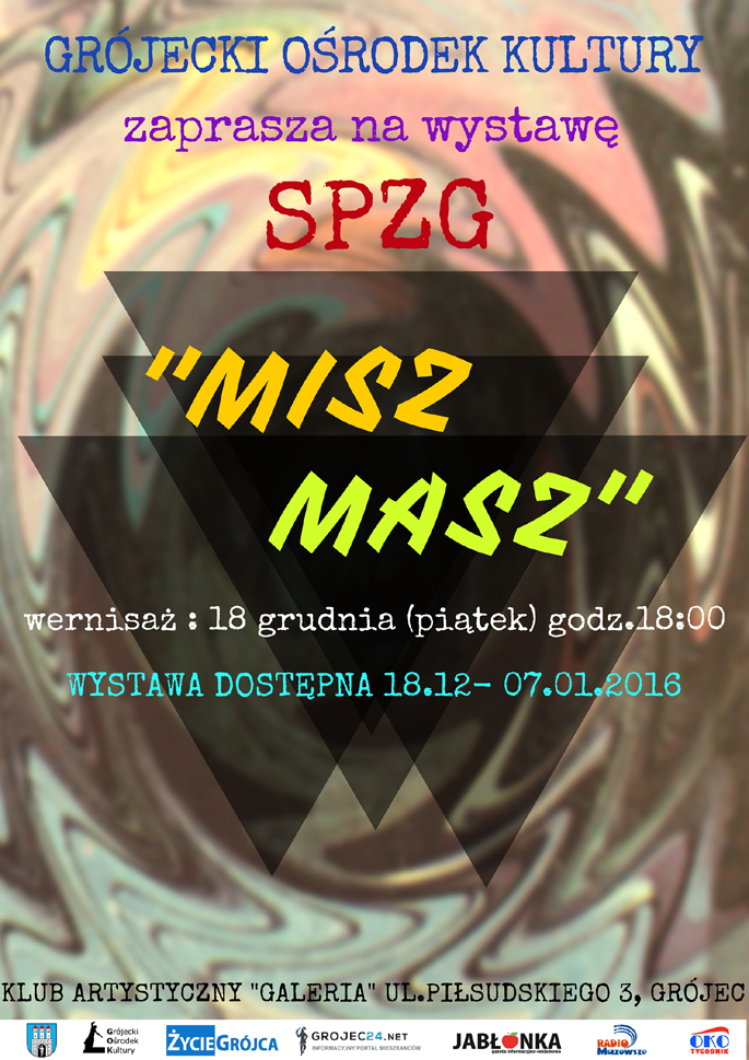 Na wystawę zatytułowaną „Misz Masz” składają się prace różnorodne zarówno pod względem tematycznym, jak i technik, w których zostały wykonane. Pojemność znaczeniowa tytułu wystawy powoduje, iż widz oglądając obrazy może spodziewać się pewnego rodzaju wieloaspektowości rozwiązań artystycznych i tematycznych prezentowanych prac. Gorąco zapraszam tym bardziej, że autorami prac są nasi lokalni artyści i osoby mocno związane z Grójcem. Wystawa dostępna 18.12- 07.01. 2016.