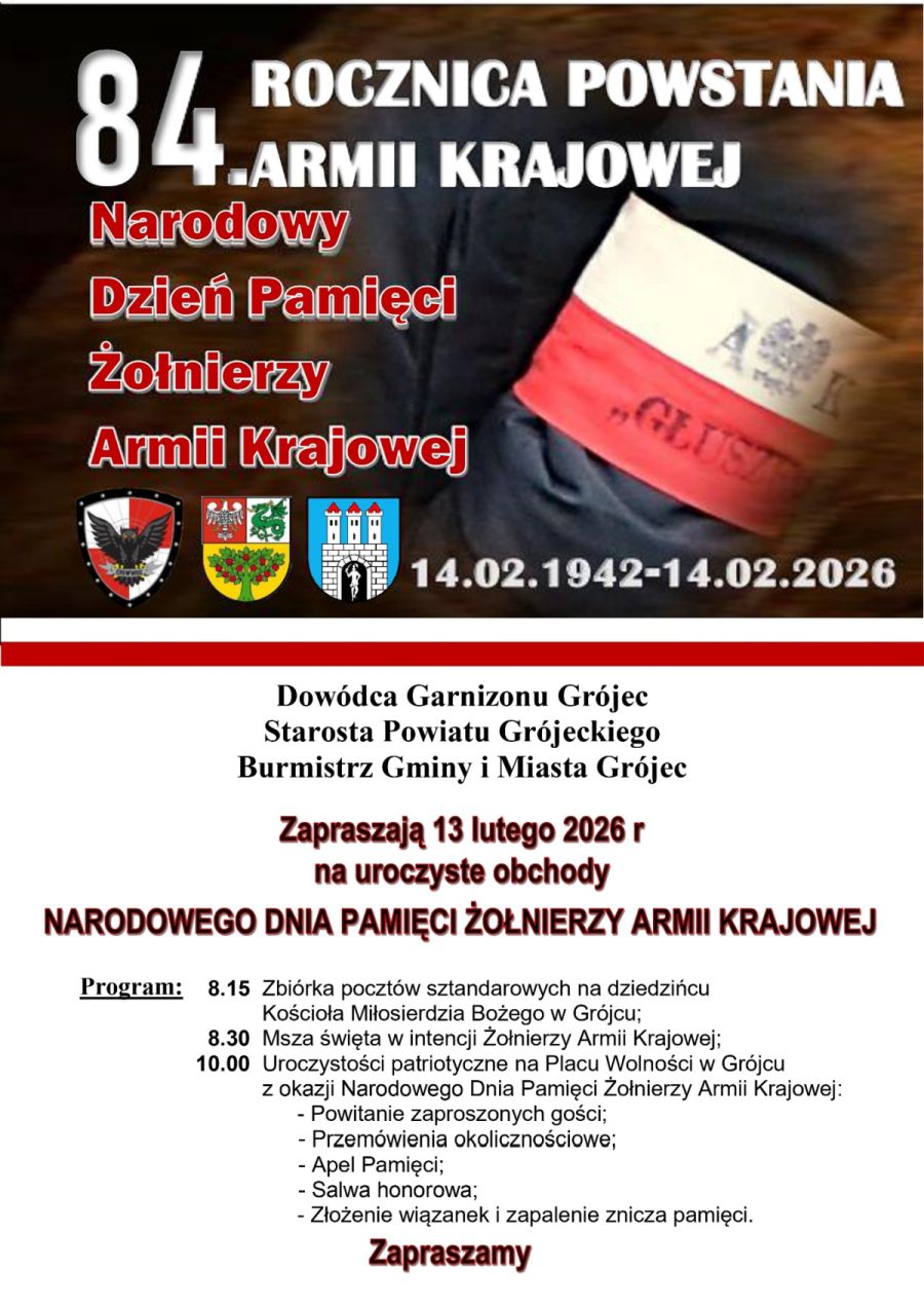 Burmistrz Gminy i Miasta Grójec serdecznie zaprasza wszystkich mieszkańców do wspólnego uczczenia Narodowego Dnia Pamięci Żołnierzy Armii Krajowej.