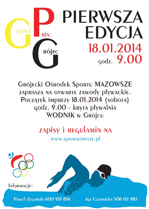 Grójecki Ośrodek Sportu MAZOWSZE zaprasza na otwarte zawody pływackie. Początek imprezy 18.01.2014 (sobota) godz. 9.00 - kryta pływalnia WODNIK w Grójcu.