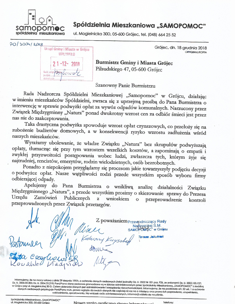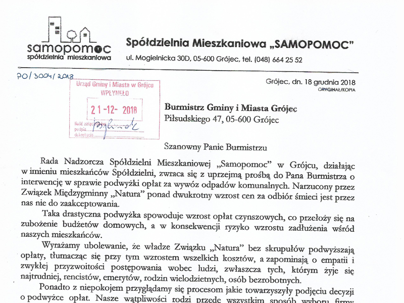 Rada Nadzorcza Spółdzielni Mieszkaniowej "Samopomoc" w Grójcu wystosowała pismo do Burmistrza Gminy i Miasta Grójec w sprawie podwyżki opłat za wywóz odpadów komunalnych.