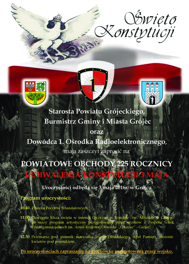 Marek Ścisłowski - Starosta Powiatu Grójeckiego, Jacek Stolarski - Burmistrz Gminy i Miasta Grójec, płk Andrzej Kozera - Dowódca 1. Ośrodka Radioelektronicznego mają zaszczyt zaprosić na: POWIATOWE OBCHODY 225. ROCZNICY UCHWALENIA KONSTYTUCJI 3 MAJA