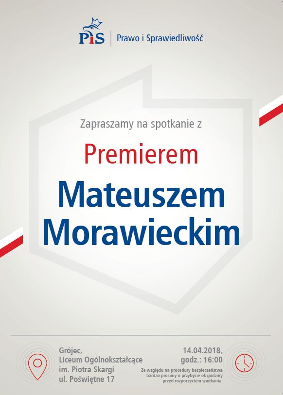 Prawo i Sprawiedliwość zaprasza na spotkanie otwarte z Panem Premierem Mateuszem Morawieckim w dniu 14.04.2018 o godz. 16:00 w Liceum Ogólnokształcącym im. Piotra Skargi w Grójcu. Spotkanie odbędzie się w ramach cyklu "Polska jest jedna".