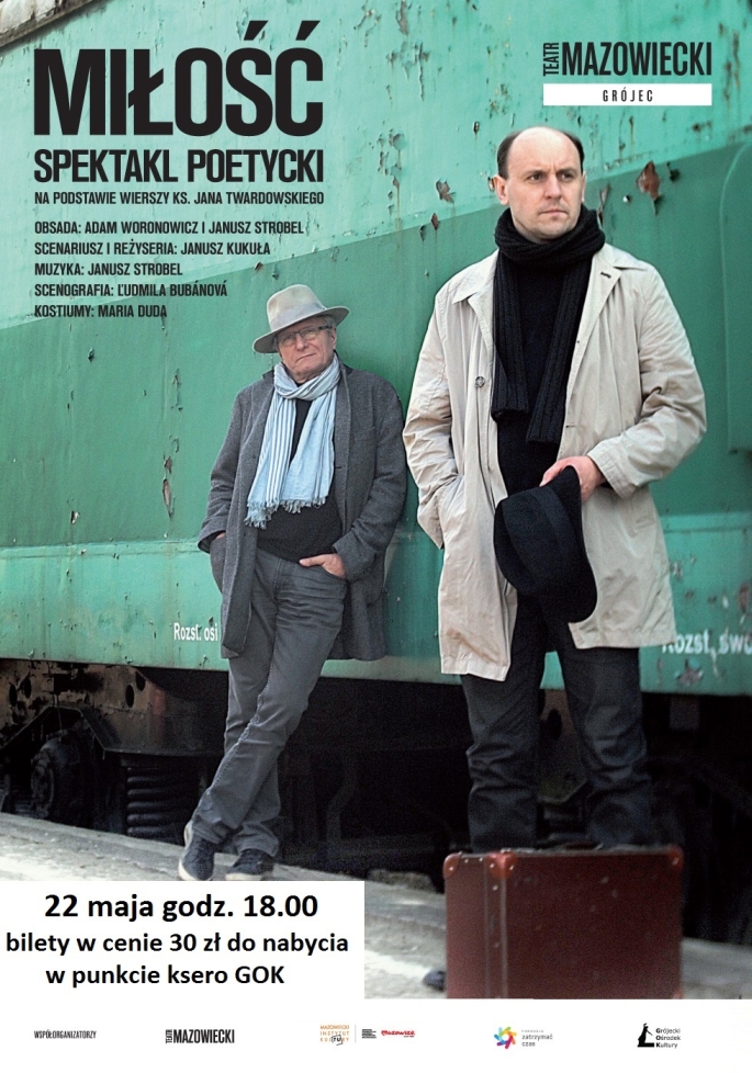 Zapraszamy na spektakl „Miłość” oparty na wierszach ks. Jana Twardowskiego, w którym zagrają: Adam Woronowicz – aktor znany z roli ks. Popiełuszki w filmie „Popiełuszko. Wolność jest w nas” oraz Janusz Strobel – gitarzysta i kompozytor. Spektakl „Miłość” to historia człowieka poszukującego odpowiedzi na pytania o sens życia i podstawowe wartości. Będziemy na stacji kolejowej „Miłość”, na której nie zatrzymują się pociągi. Wędrowiec jednak będzie czekał na „coś”, co pozwoli mu odnaleźć samego siebie.