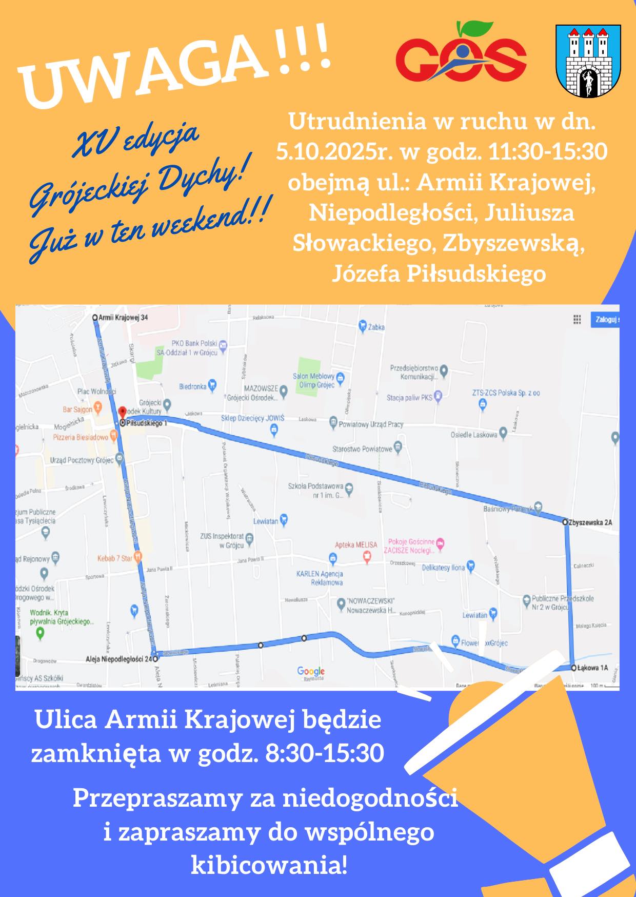 W związku z organizacją XV edycji biegu Grójecka Dycha, wystąpią zmiany w ruchu ulicznym - informuje Grójecki Ośrodek Sportu "Mazowsze".