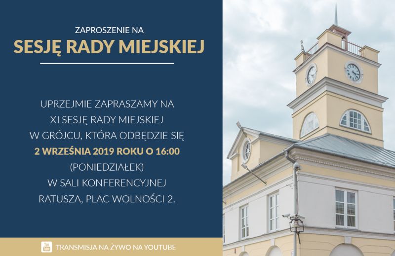 Uprzejmie zapraszamy na XI sesję Rady Miejskiej w Grójcu, która odbędzie się 2 września 2019 roku o 16:00 (poniedziałek) w sali konferencyjnej Ratusza, Plac Wolności 2.