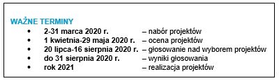 Nabór potrwa od 2 do 31 marca. Następnie wszystkie wnioski będą oceniane. Potem powstanie wykaz projektów dopuszczonych do głosowania oraz tych ocenionych negatywnie. Od oceny negatywnej będzie można się odwołać. Ostatnim etapem będzie głosowanie, podczas którego Mazowszanie zdecydują, jakie inicjatywy będą w przyszłym roku realizowane w ramach BOM. Głosowanie potrwa od 20 lipca do 16 sierpnia br. Każdy mieszkaniec Mazowsza będzie mógł oddać dwa głosy – jeden na projekt z puli ogólnowojewódzkiej i jeden z podregionalnej. W imieniu osoby małoletniej głos oddaje jej przedstawiciel ustawowy. Głosować można będzie wyłącznie internetowo za pośrednictwem platformy internetowej. Mieszkańcy bez dostępu do komputera lub internetu będą mogli oddać głos, korzystając ze specjalnie w tym celu przygotowanych stanowisk w siedzibie urzędu i w delegaturach. Ostateczną listę wybranych projektów poznamy pod koniec sierpnia.