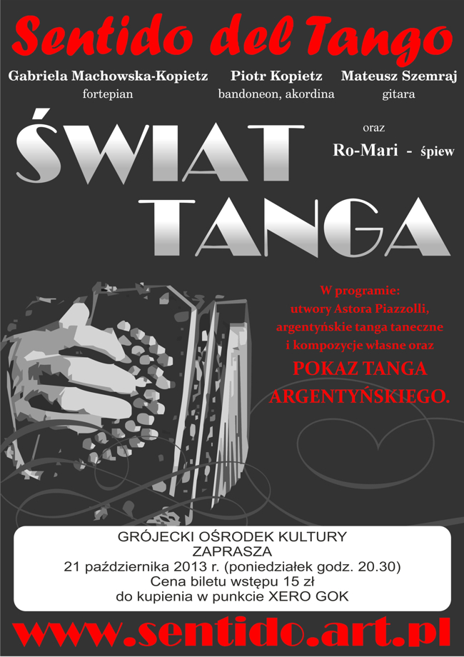 Grójecki Ośrodek Kultury zaprasza na Świat Tanga. W programie utwory Astora Piazzolli, argentyńskie tanga taneczne oraz pokaz tanga argentyńskiego. Impreza odbędzie się w poniedziałek 21 października. Bilety w cenie 15 zł do kupienia w punkcie Xero GOK.