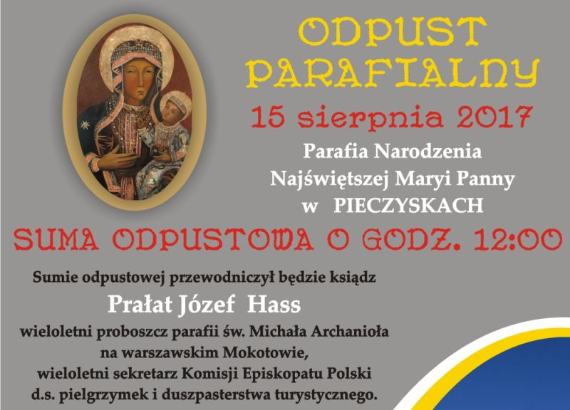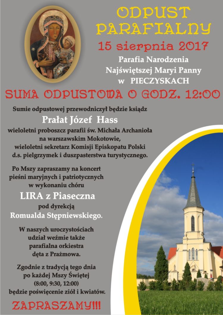 Parafia Narodzenia NajŚwiętszej Maryi Panny w PIECZYSKACH zaprasza na ODPUST PARAFIALNY 15 sierpnia 2017.