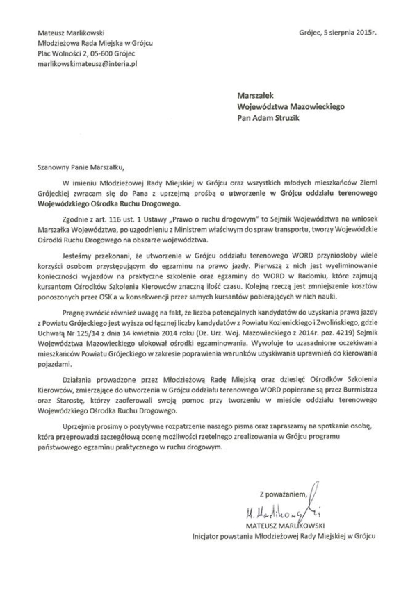 Mateusz Marlikowski - inicjator powstania Młodzieżowej Rady Miejskiej w Grójcu, działając w porozumieniu z grójecką młodzieżą oraz instruktorami Ośrodków Szkolenia Kierowców wystosował pismo do Marszałka Województwa Mazowieckiego Adama Struzika z prośbą o otworzenie w Grójcu oddziału terenowego Wojewódzkiego Ośrodka Ruchu Drogowego.