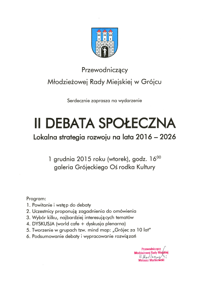 Młodzieżowa Rada Miejska w Grójcu zaprasza na drugą Debatę Społeczną.
