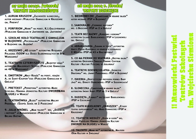 W dniach 27-28 maja w sali widowiskowej Grójeckiego Ośrodka Kultury odbędzie się II Mazowiecki Festiwal Teatrów Szkolnych im. Wojciecha Siemiona. Patronat medialny sprawuje Grojec24.net. Start Festiwalu godz. 9.00. Serdecznie zapraszamy!