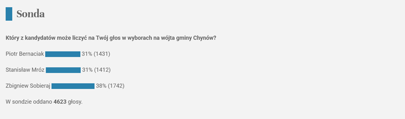 W sondzie przeprowadzonej w dniach 14-28 listopada na łamach naszego portalu oddano aż 4623 głosy. Najwięcej uzyskał Zbigniew Sobieraj - 1742 (38 proc.). Na drugim miejscu jest Piotr Bernaciak - 1431, który minimalnie wyprzedza Stanisława Mroza (1412). Obaj kandydaci uzyskali po 31 procent poparcia.