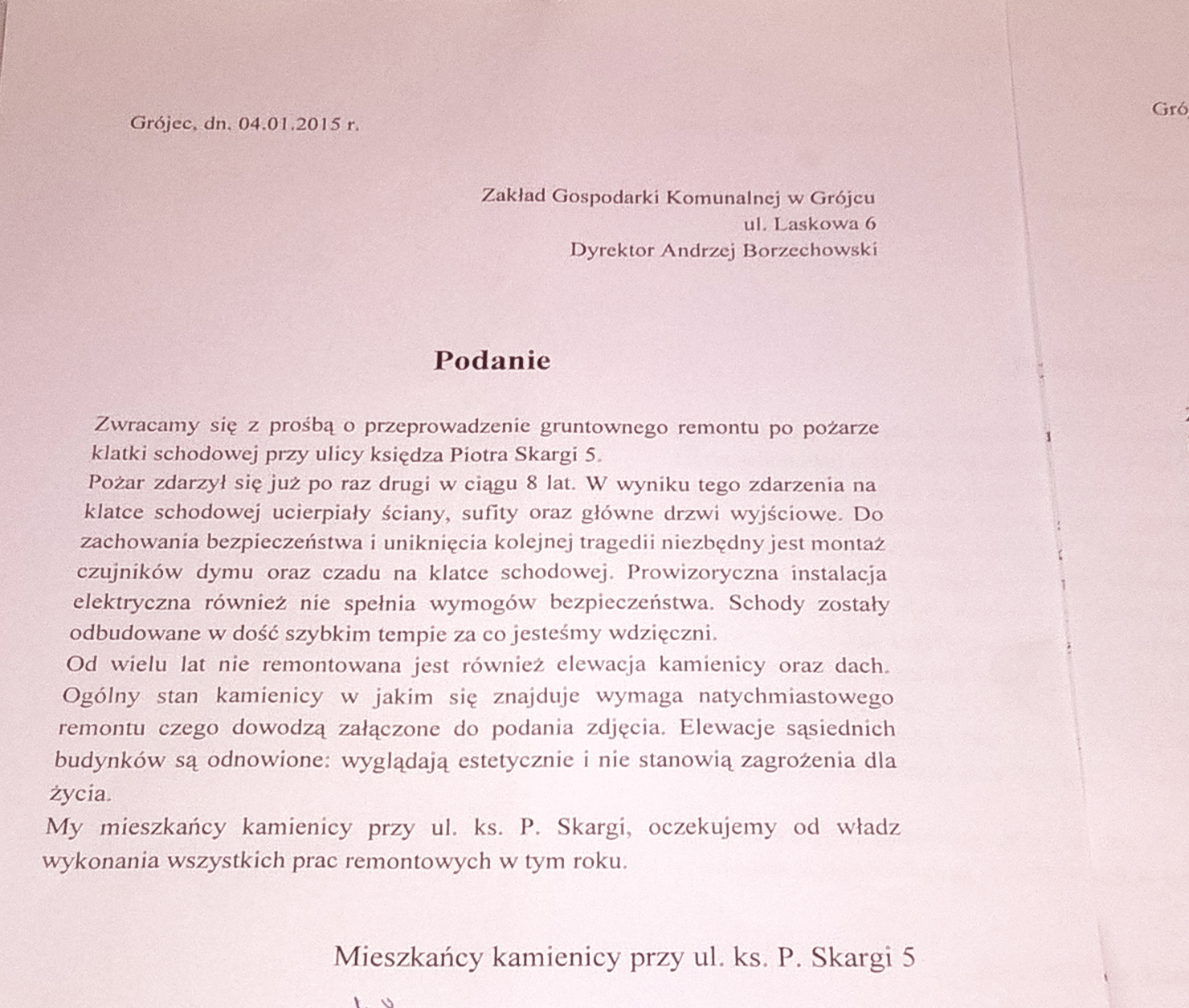 W piątek 8 stycznia do Zarządu Gospodarki Komunalnej oraz Urzędu Gminy i Miasta Grójec, wpłynęły podania wraz z dołączonymi płytami CD ze zdjęciami stanu kamienicy. Dokumenty były zaadresowane bezpośrednio do dyrektora Andrzeja Borzechowskiego (ZGK) oraz burmistrza Jacka Stolarskiego.