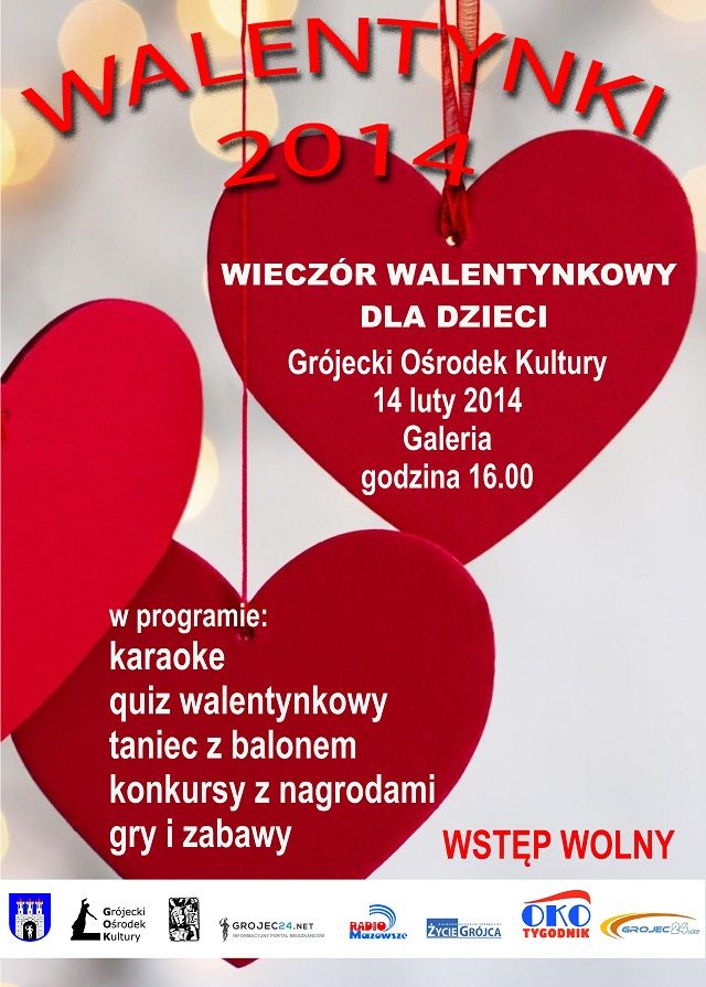 Grójecki Ośrodek Kultury zaprasza na wieczór walentynkowy dla dzieci. W programie karaoke, quiz walentynkowy, taniec z balonem, konkursy z nagrodami, gry i zabawy. Wstęp wolny.
